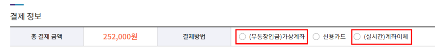 1. 결제시 (무통장입금)가상계좌, (실시간)계좌이체 선택